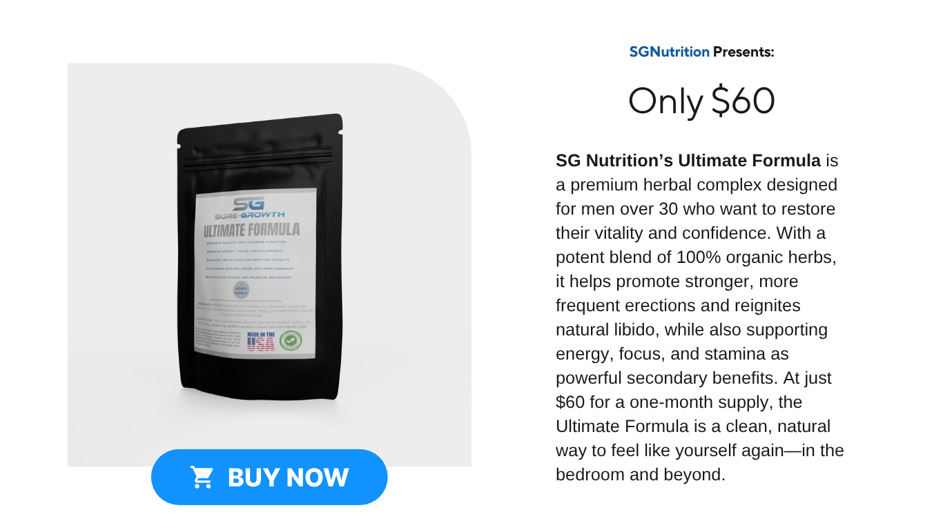 In 2011, SG Nutrition created The Ultimate Formula — a breakthrough herbal complex designed to help support healthy testosterone levels, enhance vitality, and revive natural drive and stamina. Made with 100% natural ingredients, it helps you feel more energetic, focused, and confident that you’ll be able to perform when the time is right.